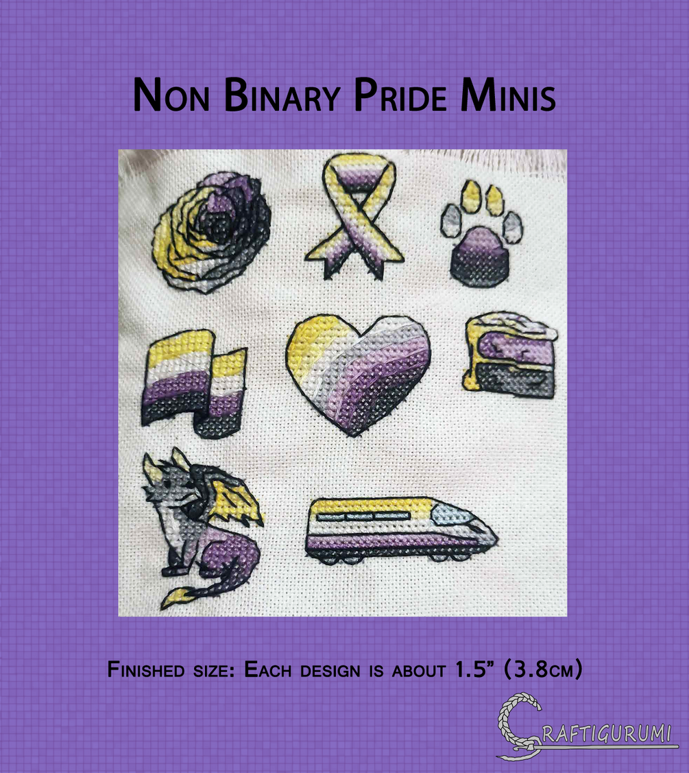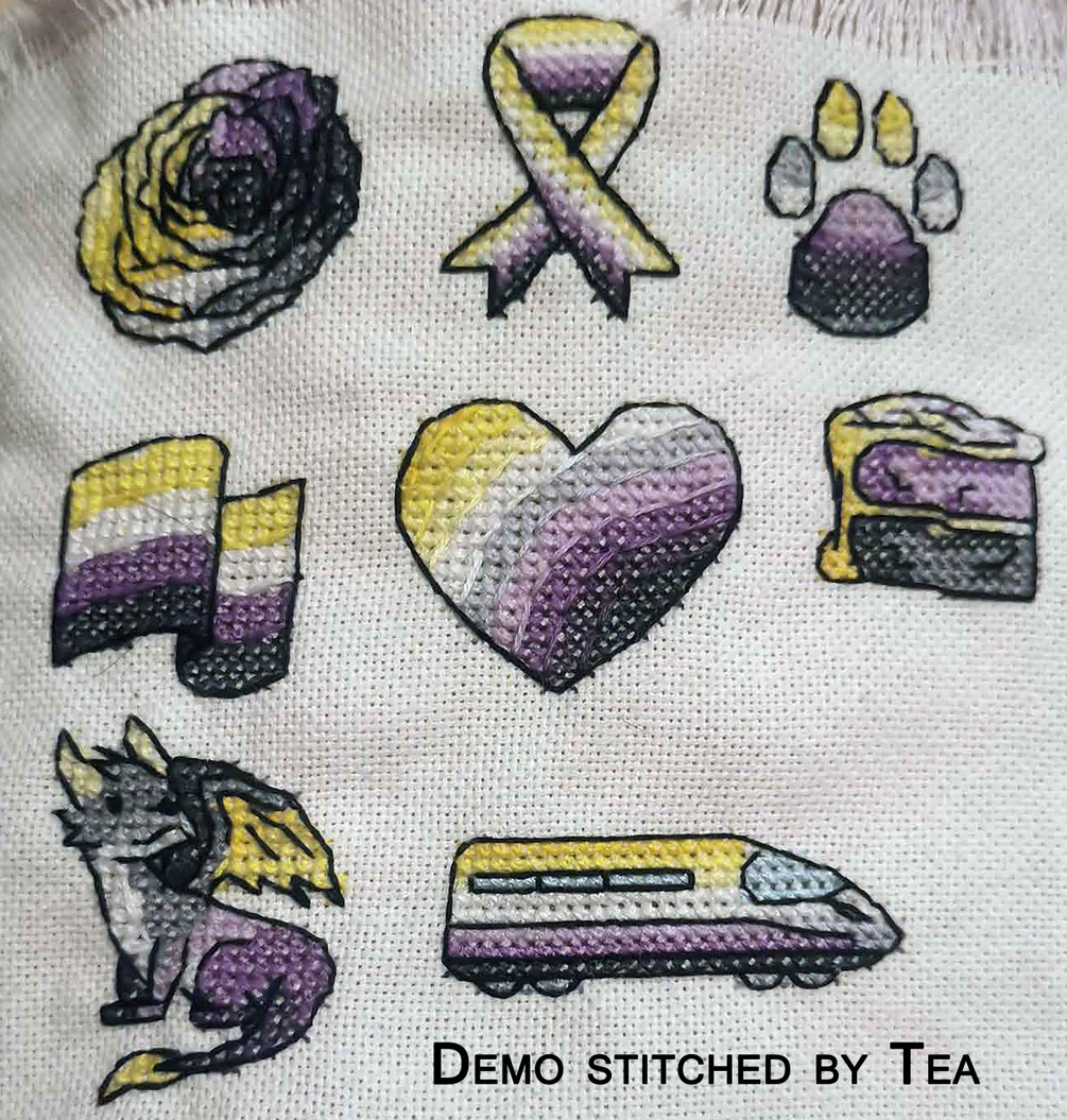 This Pride Minis Pattern features 8 mini designs all with the rainbow pride flag color scheme. All designs were either my own ideas or suggestions from the Pixel Stitch discord community and include a Rose, Heart, Paw Print, Ribbon, Flag, Slice of Cake, Dragon, and a Train. Pattern is free and any proceeds received will be donated to the Trevor Project charity for LGBTQ Youth.