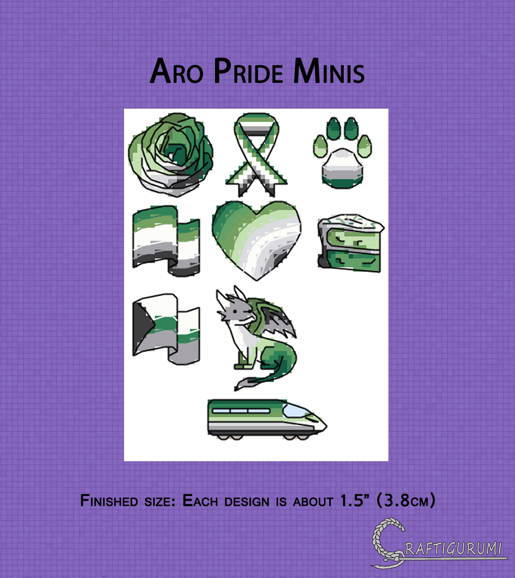 This Pride Minis Pattern features 8 mini designs all with the rainbow pride flag color scheme. All designs were either my own ideas or suggestions from the Pixel Stitch discord community and include a Rose, Heart, Paw Print, Ribbon, Flag, Slice of Cake, Dragon, and a Train. Pattern is free and any proceeds received will be donated to the Trevor Project charity for LGBTQ Youth.